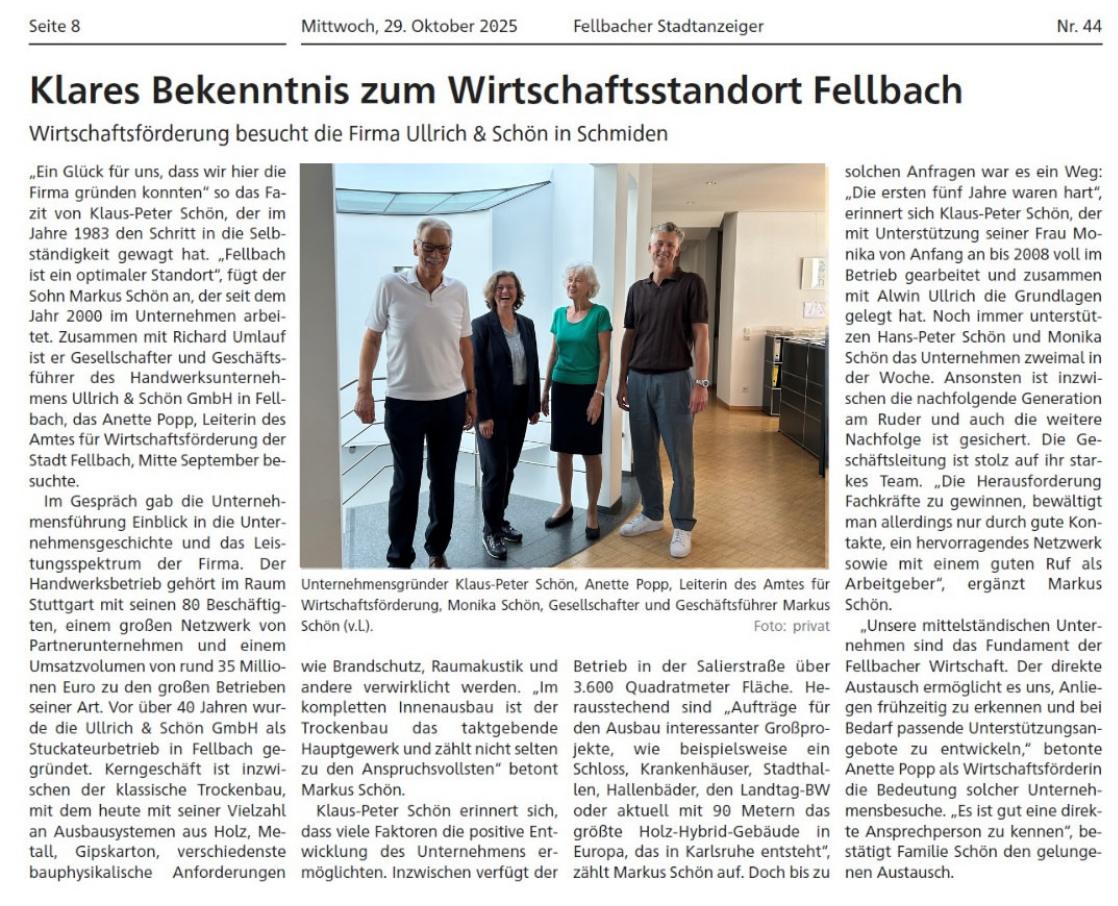 Ein ausführlicher Zeitungsbericht zum 40. Jubileum der Fa. Ullrich & Schön erschein am Samstag den 25.03.2023 in der Stuttgarter Zeitung....